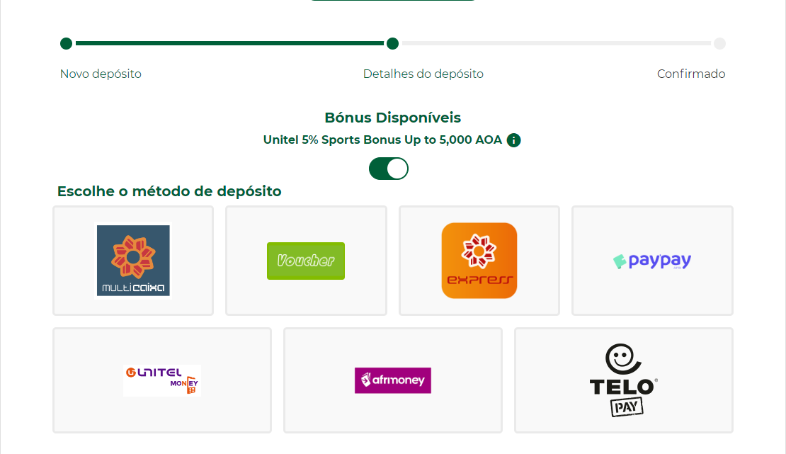 - Valor mínimo de depósito: 100 KZ (pode variar conforme o método)